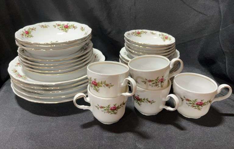 Moss Rose pattern includes five dinner plates, five salad plates, three soup bowls, five berry bowls, four bread plates and 5 cups and saucers