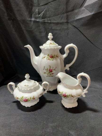 Moss Rose pattern tea pitcher, cream and sugar dishes