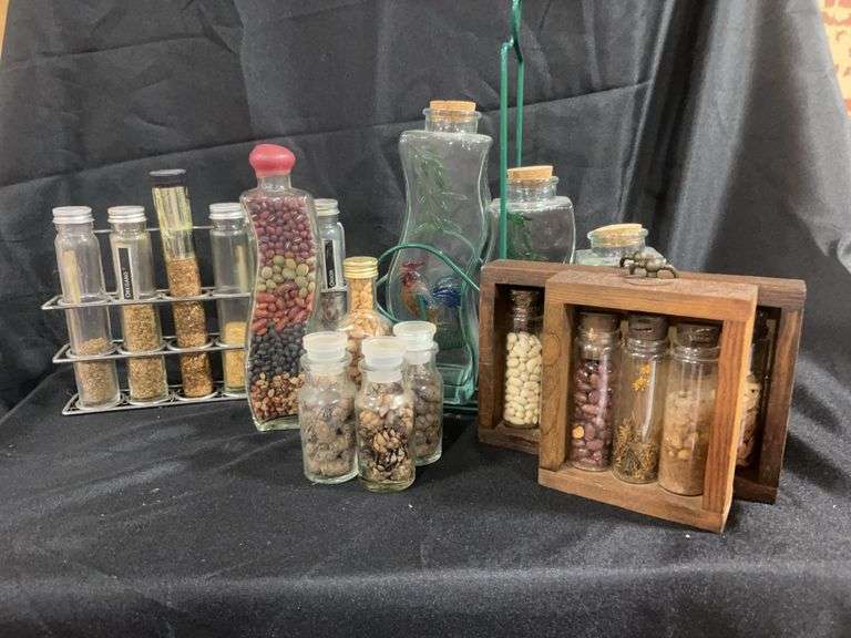 Glass jars for spices and filled with beans or dried things