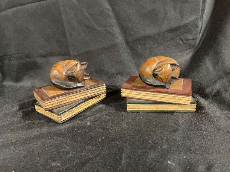 Pair of Vintage Wood Cat Sleeping on Book Stack Statues