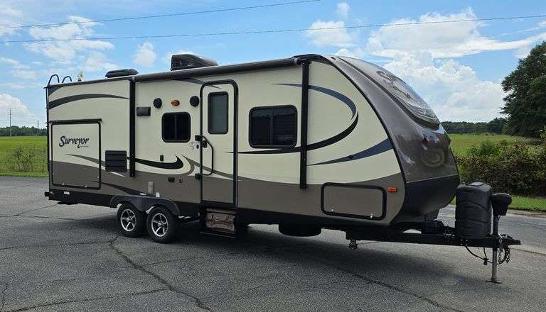 2017 Forest River Surveyor 243 RBS. Specs: 27.67', Weight: 5174 lbs, one slide, Sleeps 4. Dinning area is open for you to set up as you please. Previous owner has 2 swivel chairs. Outdoor kitchen, RV Queen front bed, Rear bath. Vin# 4X4TSVZ39HL029168 Clean South Carolina Title.