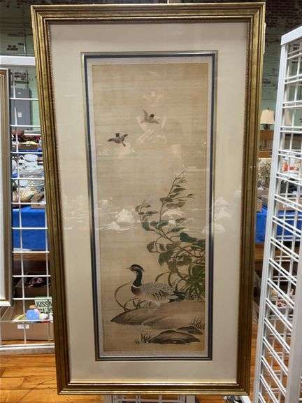 Framed Oriental style print of birds and foliage. 22 1/2 inches wide by 42 1/2 inches tall