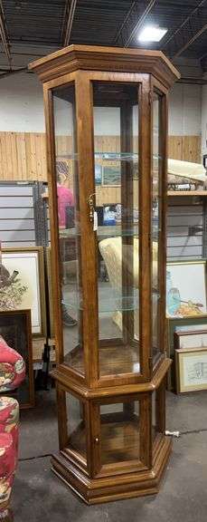 Wood frame curio cabinet has mirrored back and glass shelves. Has larger door on top and small door on bottom. 24“11“ deep 71 inches tall