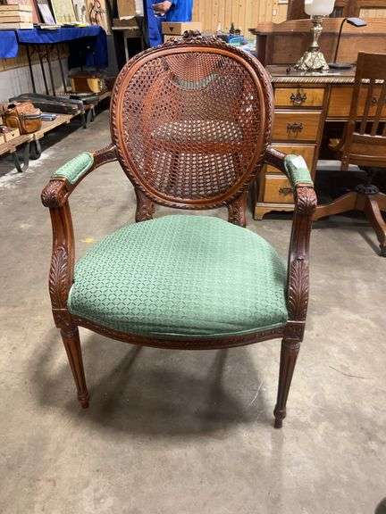 Arm chair with rattan back. 24 1/2 inches wide by 26 inches deep by 38 1/2 inches tall