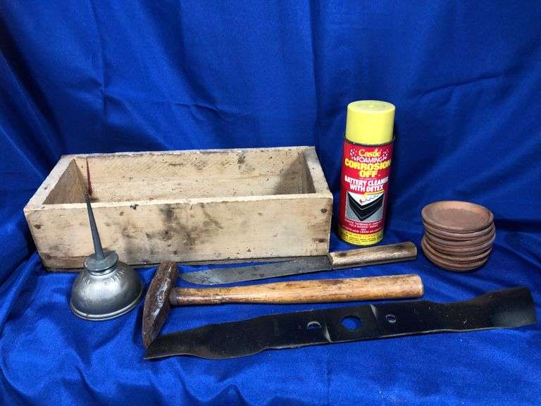 Specialty hammer, lawn mower blade, Old Hickory butcher knife, oil appliance, clay drip holders, wooden box, battery cleaner.