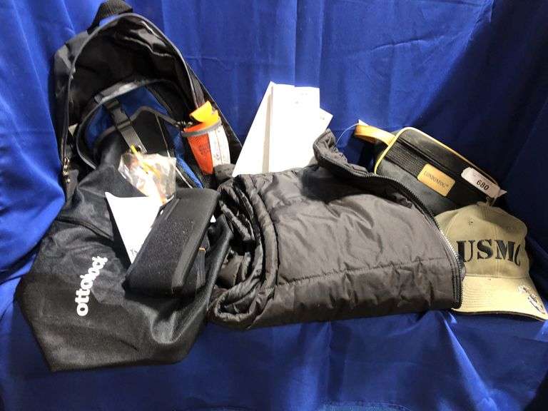AOPI back pack, ottobock items with storage bags, sleeveless puffer vest size 2XL, Londonfog shaving bag and USMC hat.