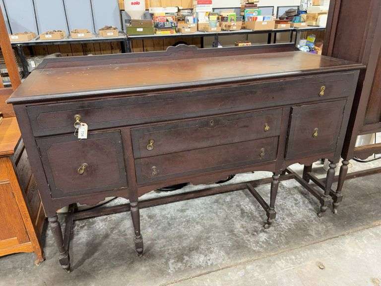 Vintage buffet with long drawer on top, two side doors and two drawers in center. On wheels. 65” wide by 22” deep x 43” tall