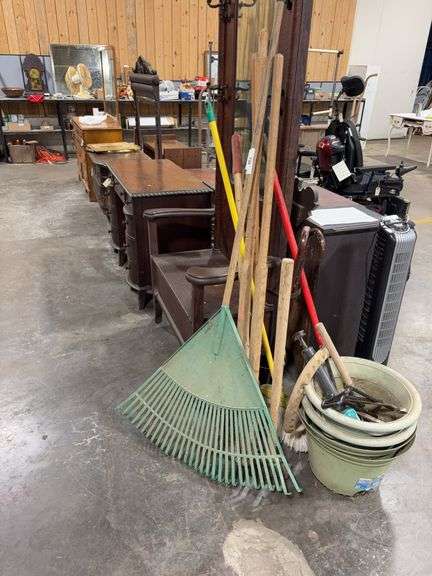 Leaf rake, sledgehammer, post hole digger, rake, pots, wrenches and more
