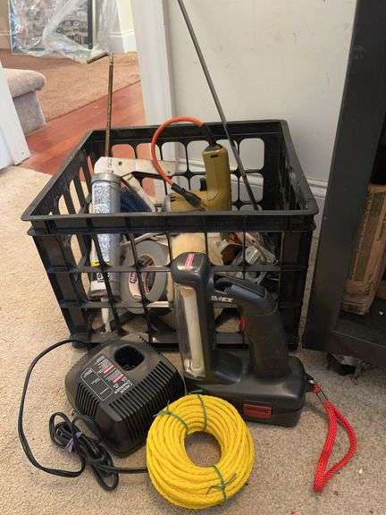 Crate with Black & Decker drill, duct tape, Craftsman flashlight with charger, caulk gun, rope and more