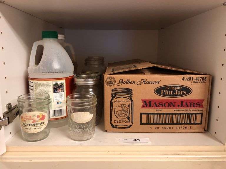 Used case of 10 pints and 2 1/2 pint jars. Also quart jar marked “Mom’s” and marked “HOME PRODUCTS COLUMBUS, OHIO.” Also half gallons of vinegar.