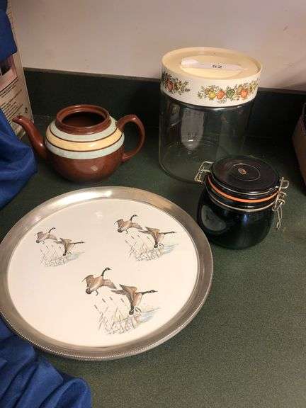 Plastic covered canister, locking lidded jar, tea pot without lid, metal tray with geese and felt on back.