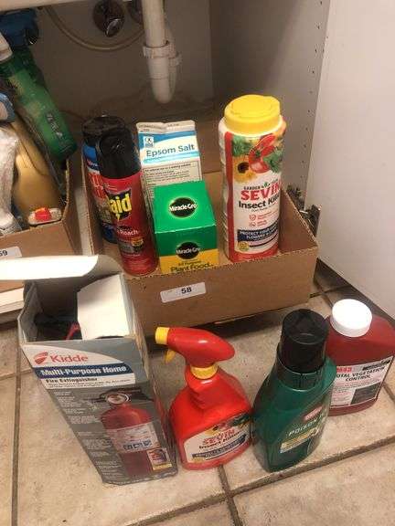 Pest and weed control. Also miracle grow and fire extinguisher showing almost in empty state