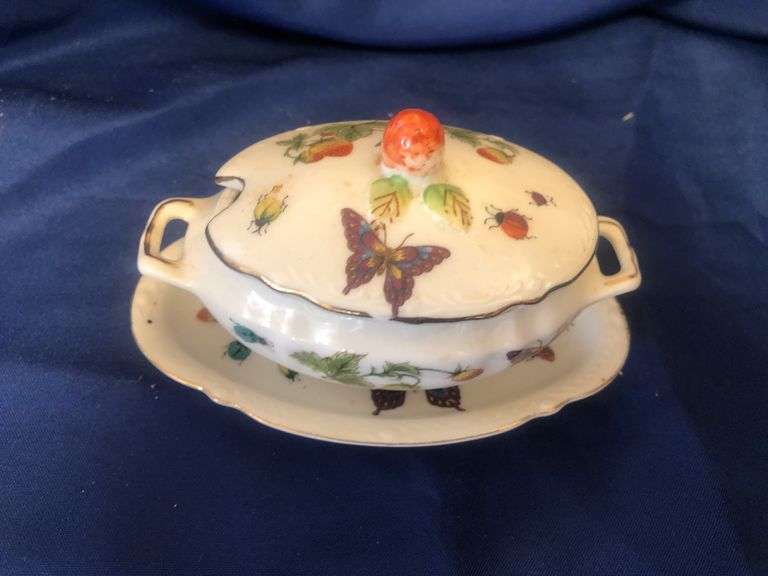 vintage porcelain covered dish by Lenwile Ardalt, featuring a hand-painted "Strawberry and Butterfly" pattern with gold trim.