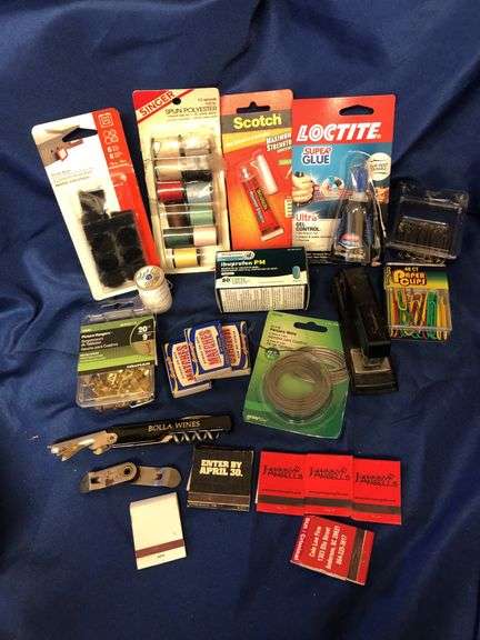 LOT 92 - Matches and office items. Also sewing thread and picture hanging items