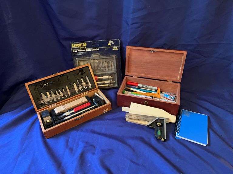 Benchtop 16 piece hobby knife set, knife set in wood box, wood box with pencils