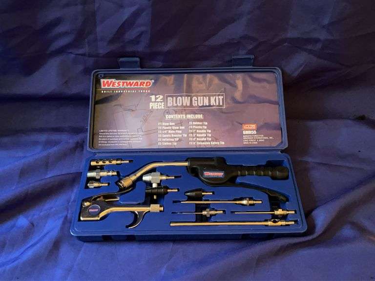 Westward 12-piece blow gun kit, model number 6MR55. It is a set of tools used for industrial applications, such as blowing air to clean surfaces or remove debris. The kit includes a pistol-grip blow gun and various nozzles and tips for different uses.