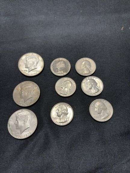 3 Kennedy 1/2 dollars and 6 quarters in metal Kodak film container