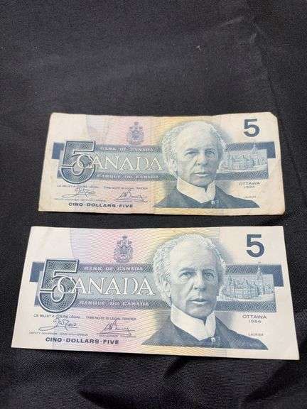 Two Canadian five-dollar notes from the "Birds of Canada" series, first issued in 1986.