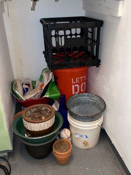 assorted planters, buckets, milk crate and other shop items.
