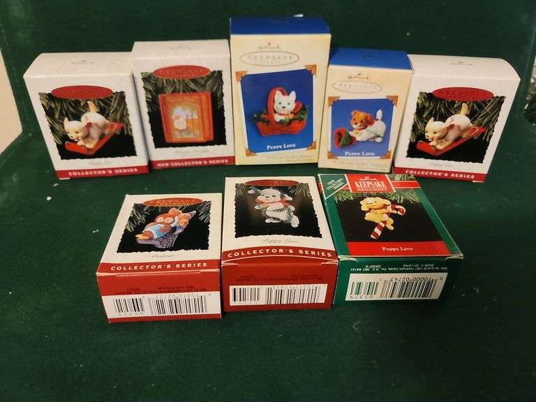 Hallmark Keepsake ornaments include several in Puppy Love series, Humpty Dumpty, and Owliver.
