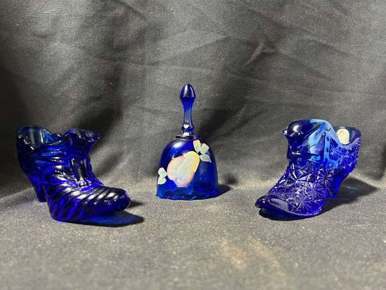 Fenton cobalt blue hand painted bell, two cobalt blue slippers.