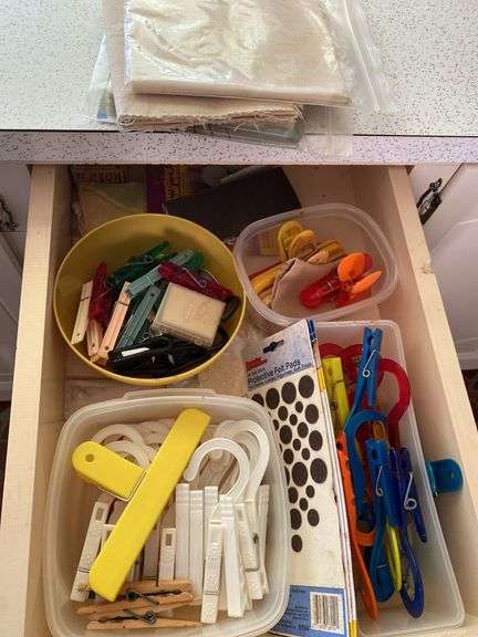 Drawer full of various clothes pins, felt protective pads and more