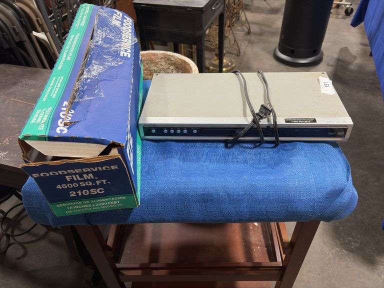 Magnavox DVD player and large roll plastic wrap (partial roll)