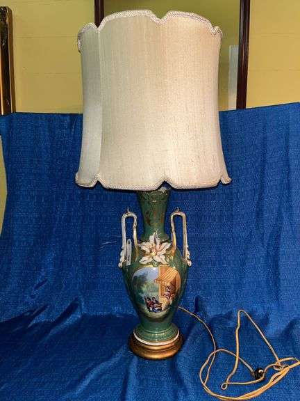 Antique green lamp with painted design. 32 1/2 inches to top of shade. Will need to be rewired