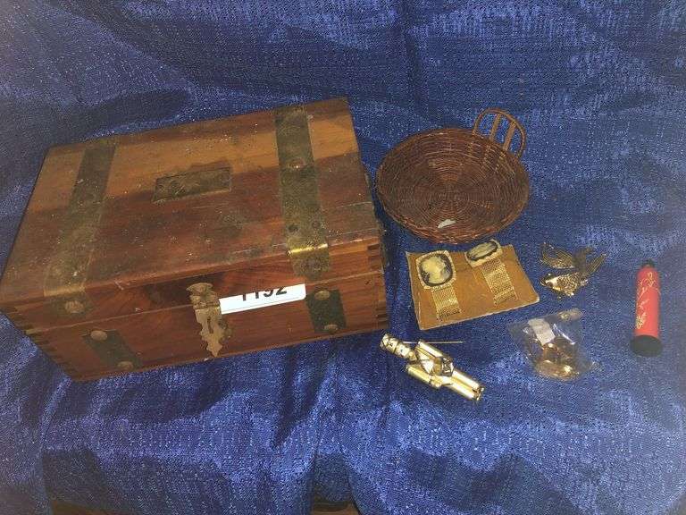 Small wood jewelry box with jewelry pins, vintage perfume bottle, gold tone cuff links