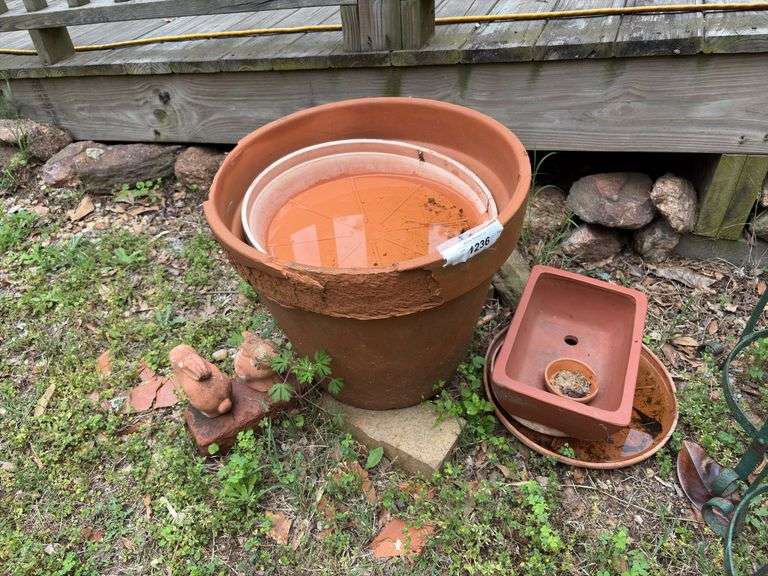 Clay/terra cotta planters, water saucers, concrete bunnies