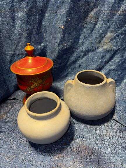 Lidded footed bowl is 9". Made in Italy; pottery bowl stamped Denmark; pottery bowl unmarked
