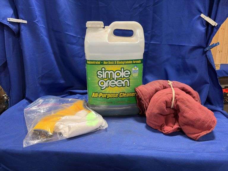 Partial jug of Simple green cleaner shop rags. Fiber towels