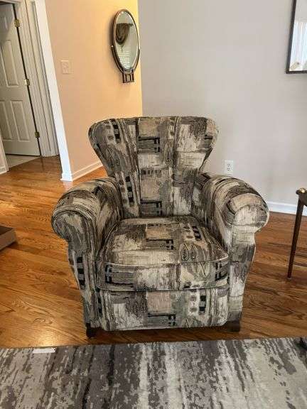Comfy arm chair has contemporary shape and upholstery 36 inches wide by 36 inches tall by 33 inches deep