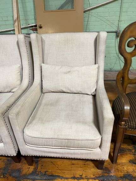 Modern style wingback chair with beige upholstery, wood legs and nailhead trim. 27 1/2 inches wide by 34 inches deep. The back of the chair is 39 inches tall.