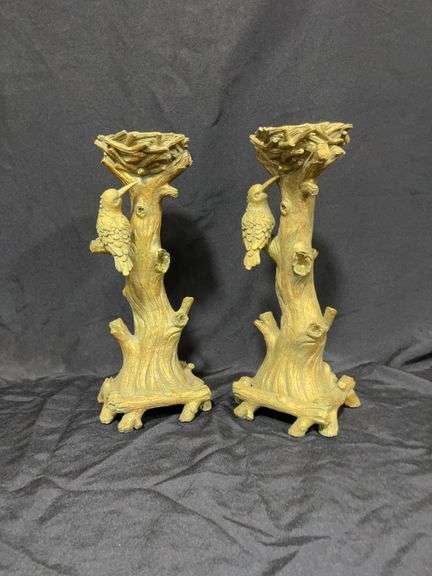 Two pillar candle holders has tree look with birds and nest. One needs gluing. 13 1/2” tall