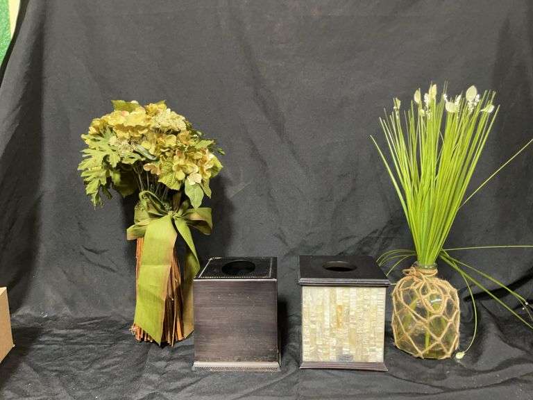 Artificial hydrangea blooms in twig style holder, two tissue holder, artificial greenery in glass jar