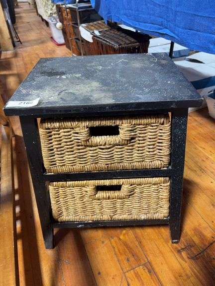 Wooden storage table with two wicker baskets 19” w x 14” d x 22” tall