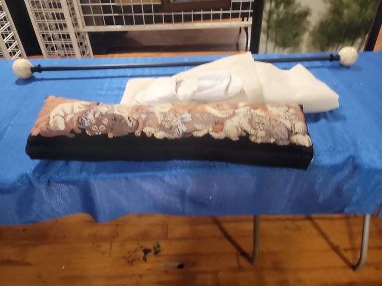 Cat pillow, shower curtain, curtain rings, house shoes and storage box
